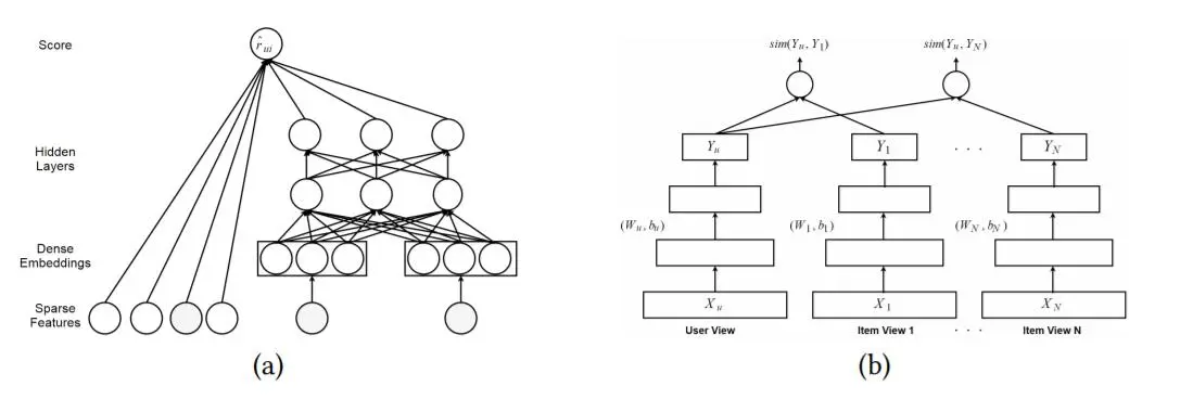 **图 2:**图示:(a)神经协同过滤;(b)深度分解机。