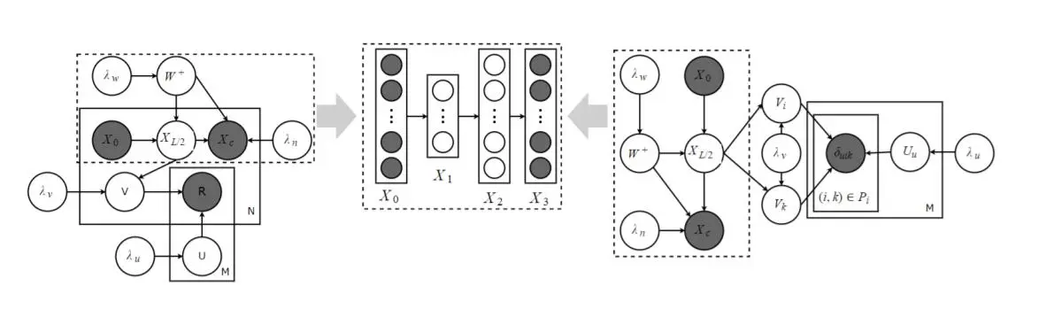 **图 5:**协同深度学习(左)和协同深度排名(右)的图模型。