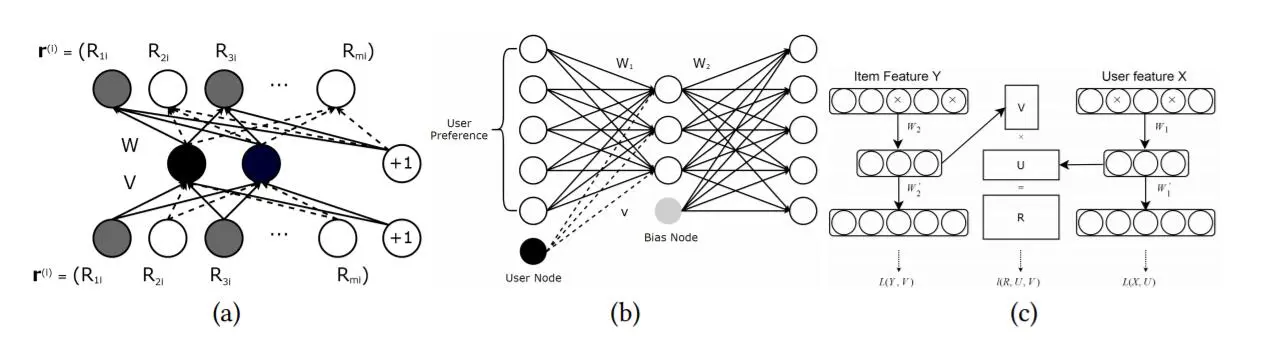 **图 4:**图示:(a)基于项目的AutoRec;(b)协同去噪自编码器;(c)深层协同过滤框架。