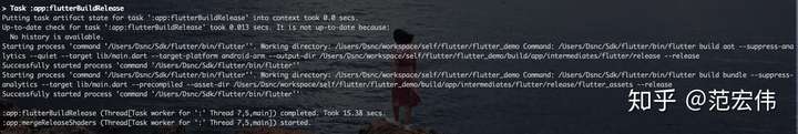这段代码初步看起来是在gradle构建过程中插入了flutterBuild和copyFlutterAssets的task,flutterBuild通过执行flutter指令将flutter相关代码进行编译,然后copyFlutterAssets将之前编译生成的flutter assets复制到Android Assets路径下,接下来通过实际编译验证。在编译过程中看到如下关键输出