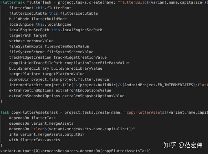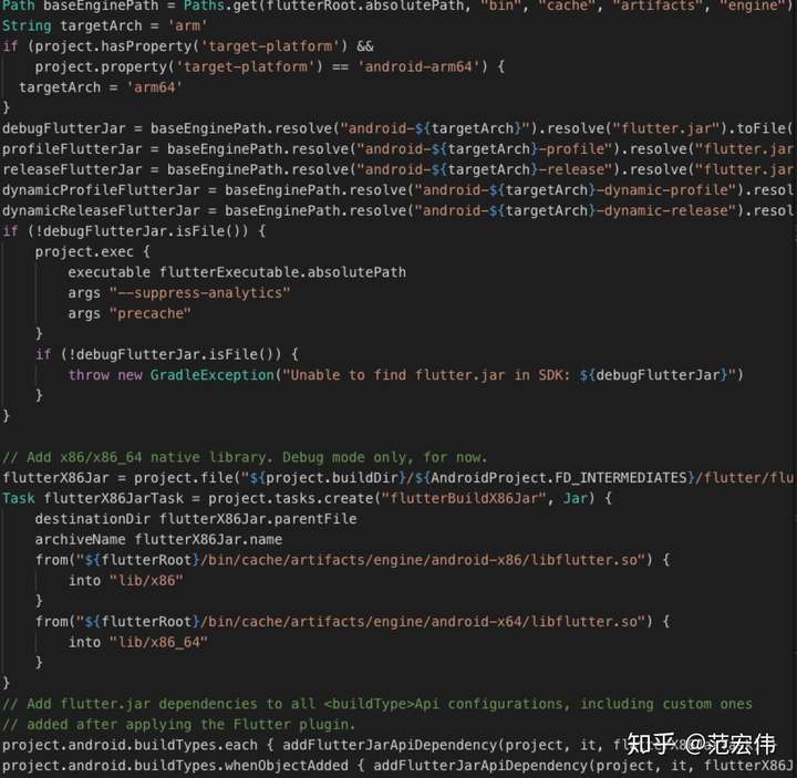 可以看到在编译过程中,会在bin、cache等目录下寻找flutter.jar,如果没有会执行flutter precahe命令,在Flutter SDK中缓存flutter.jar文件,然后将其打包到apk中。继续向下看,还发现如下代码