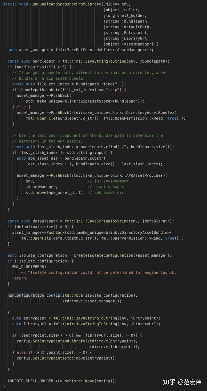 可以看到最终调用了nativeRunBundleAndSnapshotFromLibrary,并且传入了bundlePath,entrypoint,Android AssertManager。之前编译生成的flutter assets就存放在这些位置。在platform_view_android_jni.cc中找到nativeRunBundleAndSnapshotFromLibrary的实现