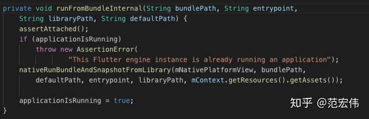 可以发现FlutterView继承自Android SurfaceView,并且在SurfaceHolder.Callback surfaceCreated中调用了nativeSurfaceCreated,并将surface传入进去进行绘制显示。同时,在FlutterView的构造方法中也看到实例化了mFlutterNavigationChannel、mFlutterSystemChannel等MethodChannel、BasicMessageChannel等对象。接着查看FlutterView.runFromBundle,通过代码调用最终调用到了FlutterNativeView的runFromBundleInternal