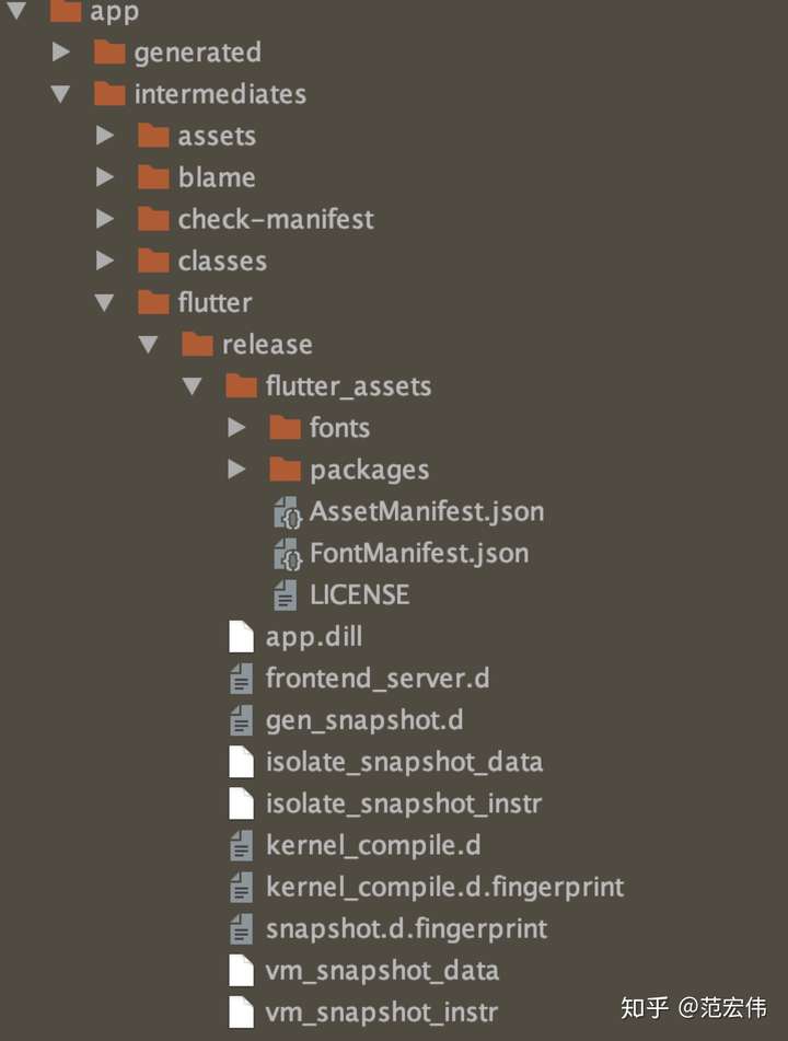 可以看到flutterBuild的确执行了flutter build aot、flutter build bundle命令,其中flutter build aot --target带的参数正是lib/main.dart,编译生成产物输出到build/app/intermediates/flutter/release文件夹下。flutter build bundle 同样带了--target lib/main.dart,在build/app/intermediates/flutter/release下生成了flutter_assets文件夹。具体详情如下