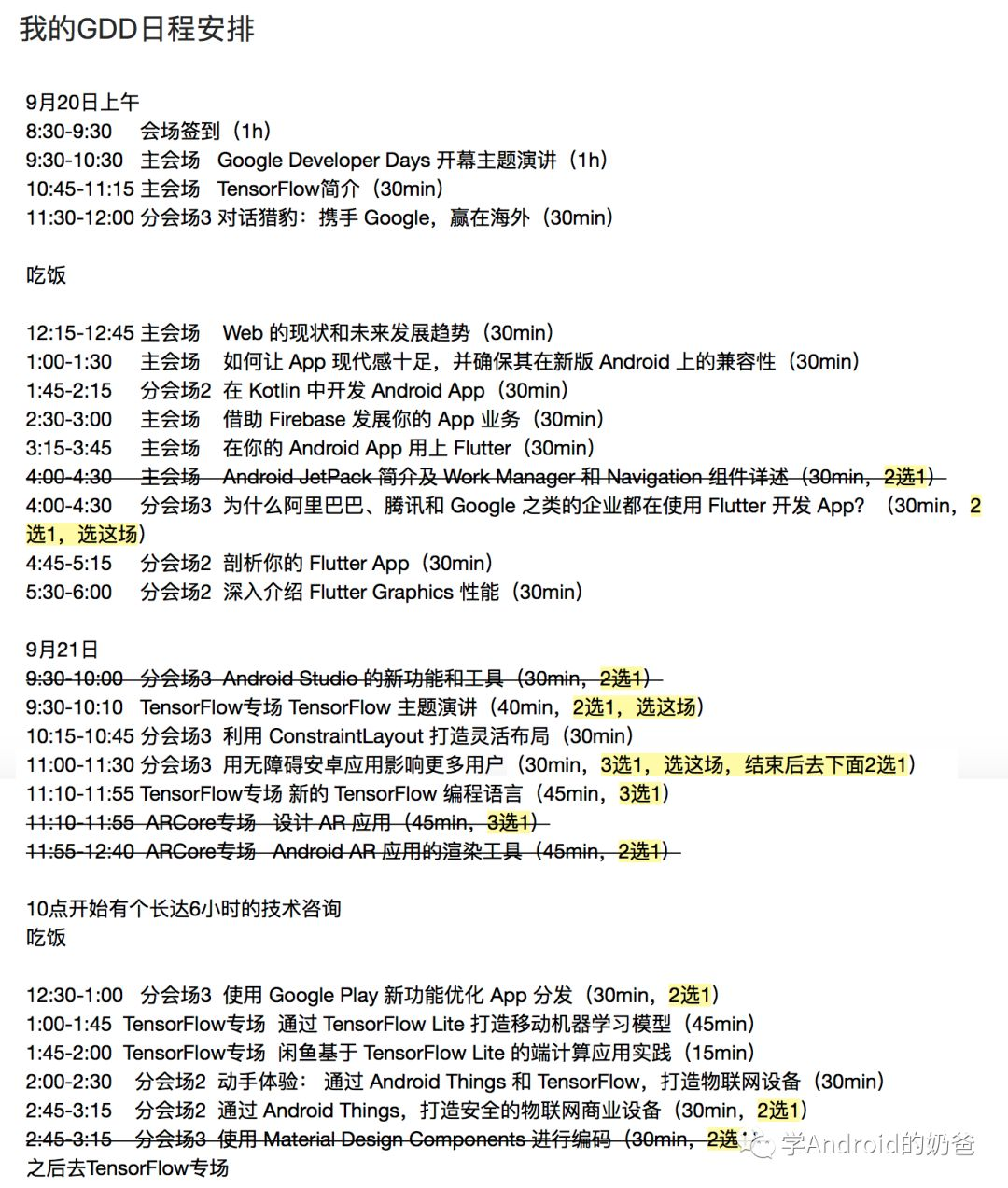 在去参会前,我浏览了一下大会的日程。总共有4个分会场,以及TensorFlow和ARCore专场。我迅速的把自己感兴趣的内容标记出来,整理好自己的参会时间表。19号傍晚一个人收拾好行李就这样屁颠屁颠的坐动车去上海了。