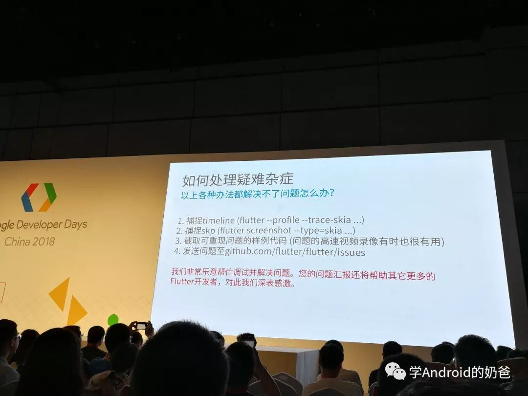 Google开发者大会(Google Developer Days,简称GDD)是展示Google最新开发者产品和平台的全球盛会,今年(2018年)是谷歌第三次在中国召开GDD。谷歌官方微信公众号在8月15日那天宣布开放报名,并于8月24日关闭报名通道。大会于9月20日和21日在上海举办,主题涵盖机器学习、ARCore、Android、Play、WearOS、无障碍、移动网络、Firebase、Assistant、物联网、云服务、Flutter、广告、设计等等。