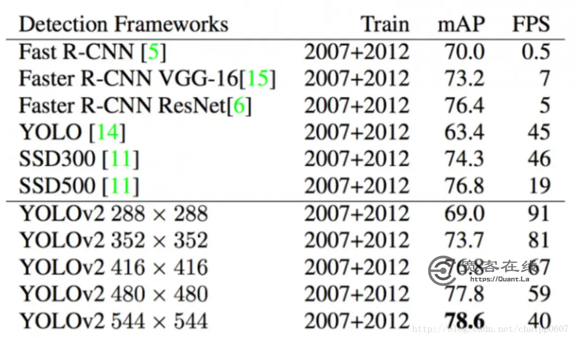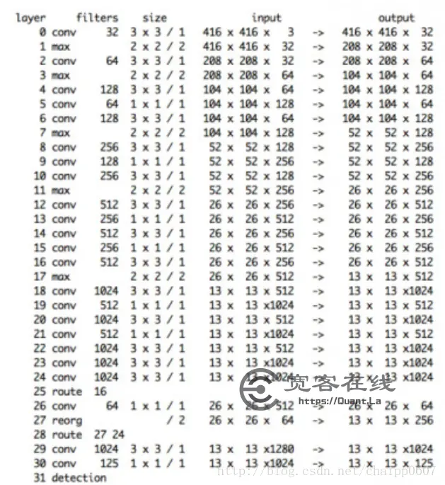 从上面的图我们可以看到YOLO 2有32层。结构还是比较常规的,主要就是在用3*3的卷积,2*2的池化和1*1的卷积。除了上面三个常规操作外,还有reorg和route,其中route在25层和28层,reorg在27层。