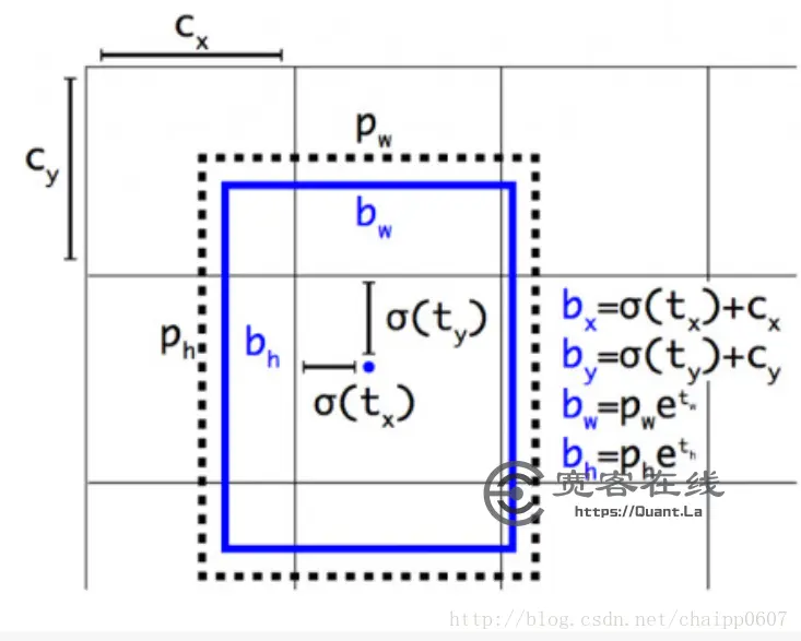 除此之外,CxCx与CyCy就是特征图上的像素点位置,δ(tx)δ(tx),δ(ty)δ(ty),txtx,tyty就是特征图上的输出。