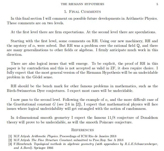 其实,在大会开幕之前,网上已经传播称阿蒂亚爵士放出了预印版论文,机器之心只查到该论文出自数小时前 Reddit 上的一篇讨论,未能确认其出处与权威性,但 Reddit 讨论中有用户表示这篇预印文章的来源似乎是一个 email list,但是最原始的发件人并不是 Atiyah,而是一个人自己说收到了 Atiyah 的 email。