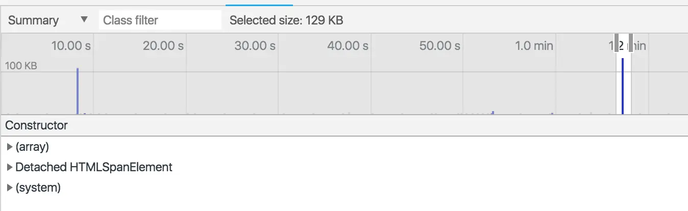 从中可以看到有array,system和Detached HTMLSpanElement。 我们知道Detached HTMLSpanElement表示已经脱离文档树的dom元素,它也是导致内存泄漏的一个经常的诱因,点击Detached HTMLSpanElement,查看详情: