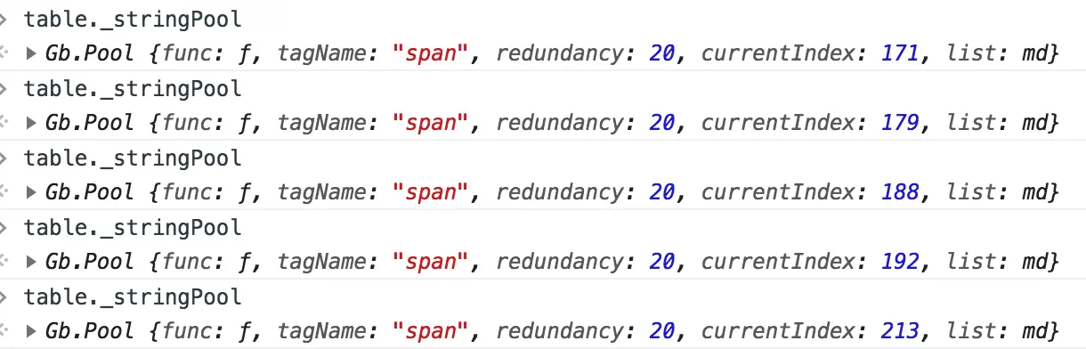 可以看到"_stringPool"这样的一个数组对象,里面放的就是Span元素,引用他的就是table,而且数量有372个之多,由于小例子使用的表格只有一行一列,这么大的数量,肯定是内存泄漏导致,直接在浏览器打印这个pool,可以看出这个数量确实在一直增加(看index的情况):