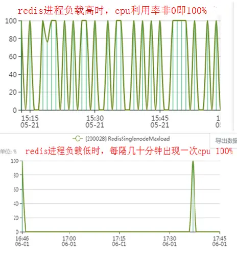 该问题现象表现在Redis进程CPU监控的峰值时而100% 时而为0,有的甚至是几十分钟都为0,突发1秒100%后又变为0,如下图。