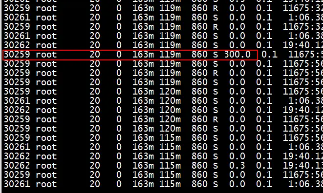 登录到机器上执行top -b -d 1 –p | grep , 可以看到进程的CPU利用率每隔几分钟到几十分钟出现一次300%,这意味着该进程3个线程占用的3个CPU都跑满了,跟监控程序呈现同样的异常。