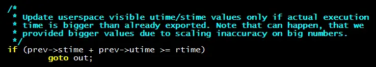 当utime+stime>=rtime的时候就直接跳出了,也就是不更新utime和stime了!这里的rtime是runtime,代表进程运行占用的所有CPU时长,正常应该等于或近似进程用户态时间+内核态时间。 但内核配置了CONFIG_VIRT_CPU_ACCOUNTING_GEN选项,这会让utime和stime分别单调增长。而runtime是调度器里统计到的进程真正运行总时长。