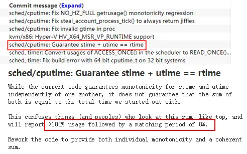 出现问题的代码位置已经找到,那就先去内核社区看看有没有成熟补丁可用,看一下kernel/sched/cputime.c的 changelog,看到一个patch:确保stime+utime=rtime。再看描述:像top这样的工具,会出现超过100%的利用率,之后又一段时间为0,这不就是我们遇到的问题吗?真是踏破铁鞋无觅处,得来全不费工夫!(patch链接:lore.kernel.org/patchwork/p…