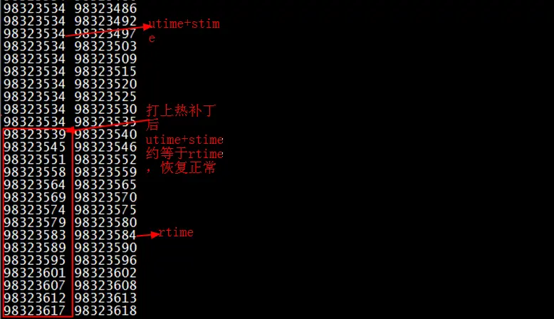 稳定性验证:先拿几台机器测试正常,再拿公司内部500台次级重要的机器打热补丁,灰度运行几天正常,从而验证了稳定性,风险尽在掌控之中。 正确性验证:找到一台出现问题的机器,同时打印utime+stime以及rtime,根据代码的逻辑,当rtime小于utime+stime时会执行老逻辑,当rtime大于utime+stime时会执行新的热补丁逻辑。如下图所示,进入热补丁的新逻辑后,utime+stime打印正常且与rtime保持了同步更新,从而验证了热补丁的正确性。