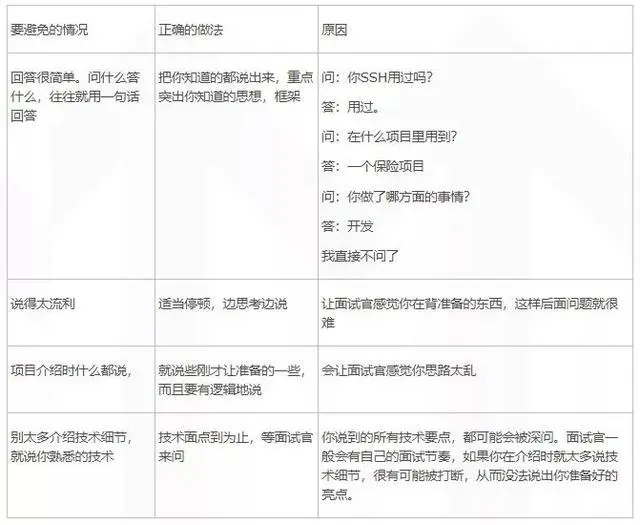 不少人是拘泥于“项目里做了什么业务,以及代码实现的细节”,这就相当于把后继提问权直接交给面试官。下表列出了一些不恰当的回答方式。