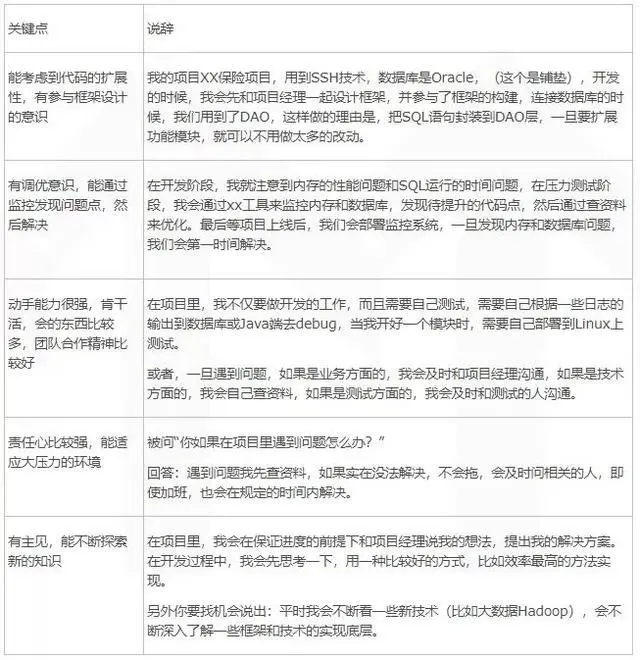 你在面试前可以根据职位的需求,准备好这种“一笔带过”的话。比如这个职位的需求点是 Spring MVC 框架,大数据高并发,要有数据库调优经验,那么介绍以往项目时,你就最好突出这些方面你的实际技能。