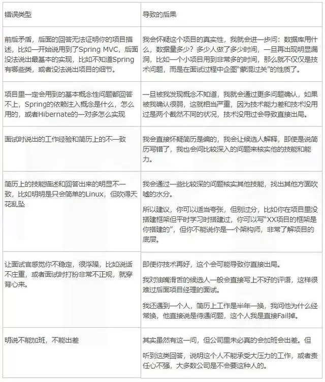 不管怎样,一旦回答简单,不主动说出你的擅长点,或没有条理很清楚地说出你的亮点。就算我让你通过面试,也不会写上“框架细节了解比较深,数据库应用比较熟练”等之类的好评语,你即使通过技术和后面的综合面试,工资也是比较低的。一旦有低级错误,可能会直接出局。