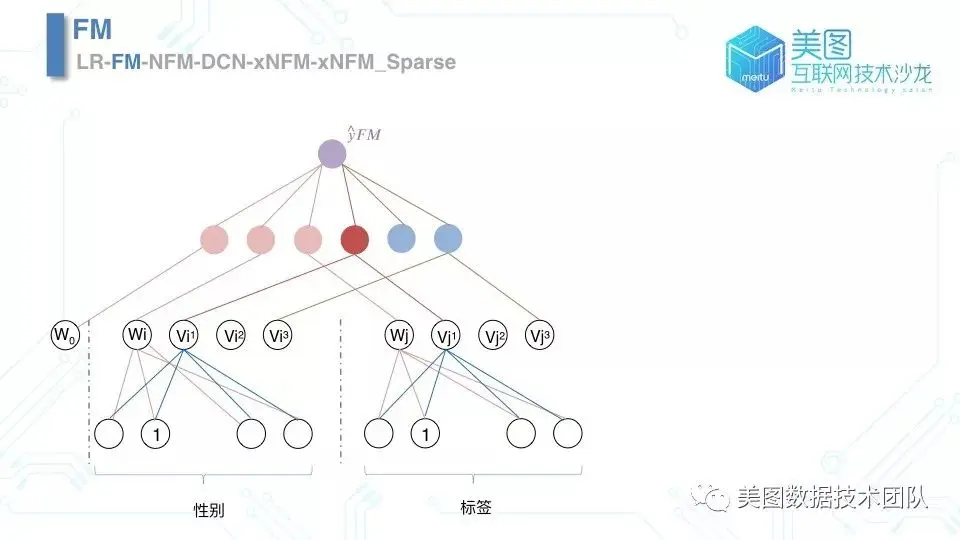 FM 模型的结构如下图所示,粉色部分表示原来的 LR 模型部分,蓝色部分表示特征交叉的学习,深红色节点表示性别与标签的二阶交叉学习。