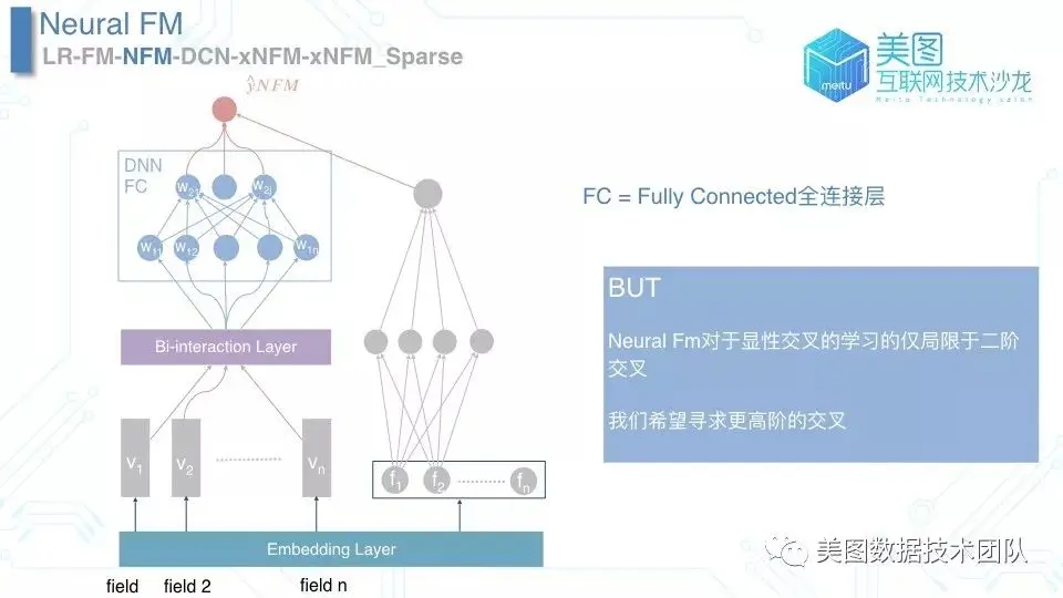 从名字上看 NFM 模型在 FM 模型之前加了一个「Neural」字段,反映在 NFM 模型的结构图中非常直观。我们在 BI-interaction layer 后接入了一个三层的 FC 全连接层(模型结构图的右侧依然是 LR 模型),通过这种方式提升了模型的非线性拟合能力。但是思考模型本身时会发现,NFM 模型与 FM模型一样依然只能捕捉二阶交叉,无法捕捉三阶甚至是更高阶的交叉。