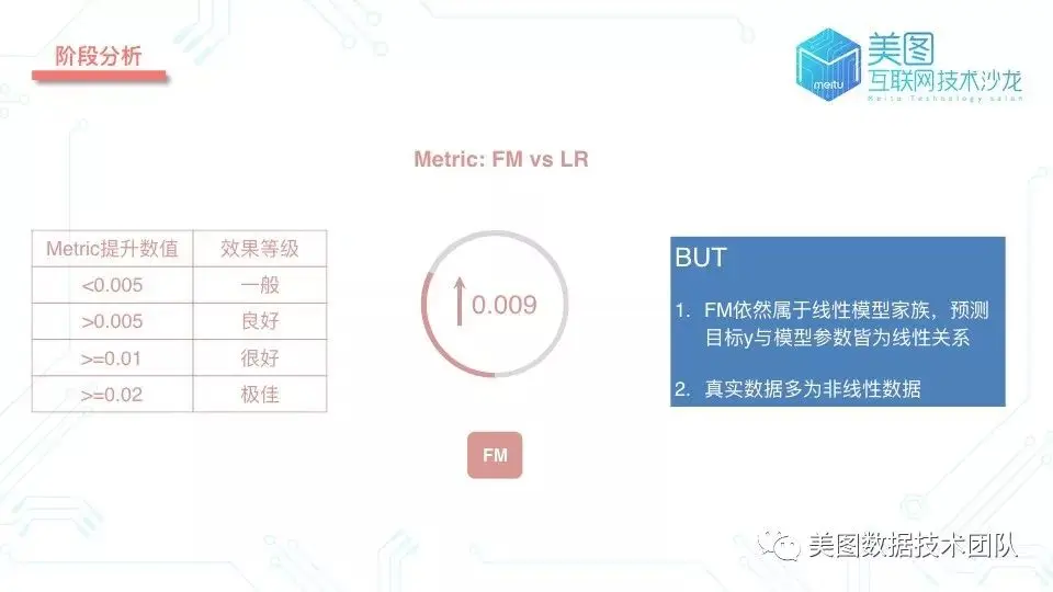 我们每次对模型做一次演化时会评估离线指标,也就是模型的拟合能力。通过下图的效果等级表可以看出:相对于 LR 模型, FM 模型离线指标有一个很好的提升。