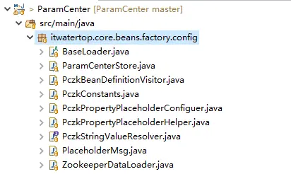 - ParamCenterStore.java 对ZooKeeper参数服务端获取的参数信息做缓存,并且将对应的使用该参数的Bean属性表达式统计,方便ZooKeeper参数变更时回调使用。