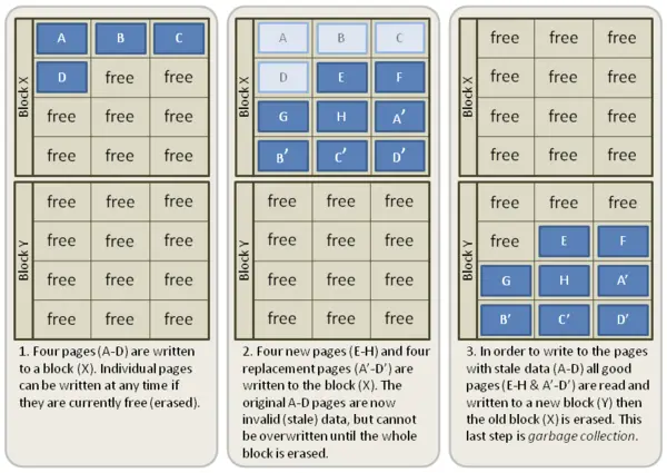 TRIM是操作系统层级的命令。**操作系统利用TRIM命令来标记SSD上某个Page的数据可以回收。**一旦某个Page被SSD标记为可以回收,在SSD空闲的时候SSD的主控芯片会将这些被标记的Page数据收集到同一个Block,然后共同擦除。这样每次需要写数据时,就在已经有足够空闲的Page可以写入新的数据。