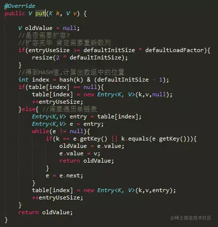 第三,要根据Key计算出在Entry[]中的位置,定位后,如果Entry[]中的元素为null,那么可以放入其中,如果不为空,那么得遍历单链表,要么更新value,要么形成一个新的Entry“挤压”单链表!