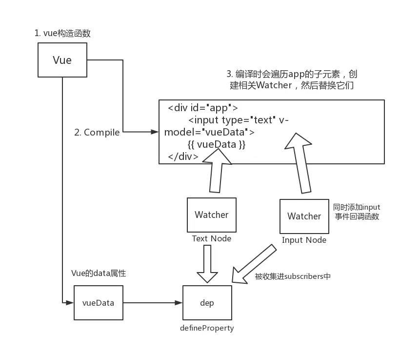 - 绑定过程是每一个与Vue.data中数据相关的节点,都会创建Watcher对象,然后这个代表节点的Watcher会被收集到数据自己的dep中,当这个数据变化时,会遍历dep中的Watcher。