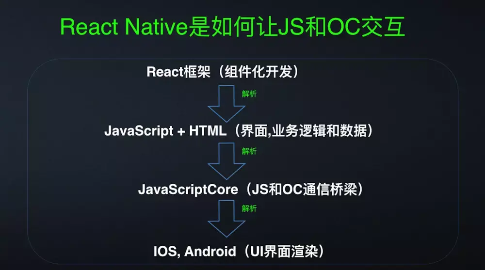 而在ios里面有一个JavaScriptCore的框架,通过它就能实现JS和OC(通过它可以调用和渲染原生模块)交互