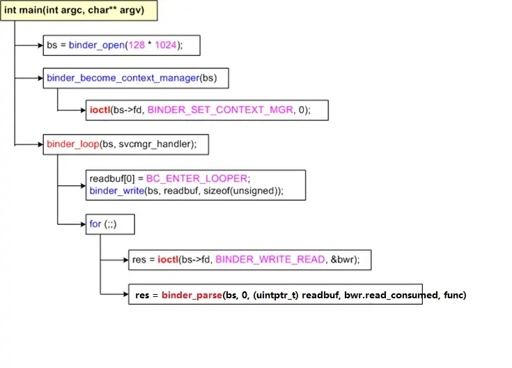 main()主要进行了三项工作: (1) 、通过binder_open()打开”/dev/binder”文件,即打开Binder设备文件。 (2) 、调用binder_become_context_manager(),通过ioctl()告诉Binder驱动程序自己是Binder上下文管理者。 (3) 、调用binder_loop()进入消息循环,等待Client的请求。如果没有Client请求,则进入睡眠等待状态;当有Client请求时,就被唤醒,然后读取并处理Client请求。