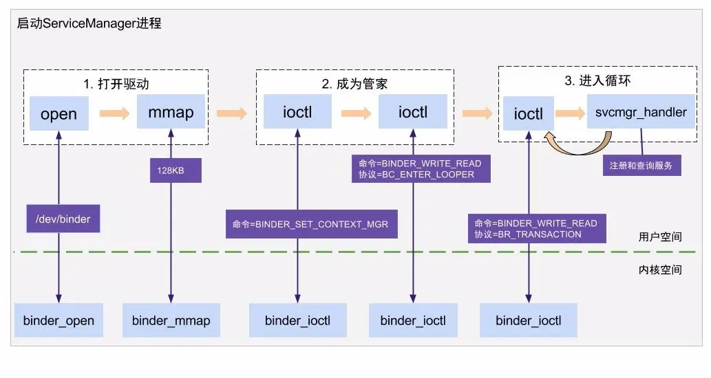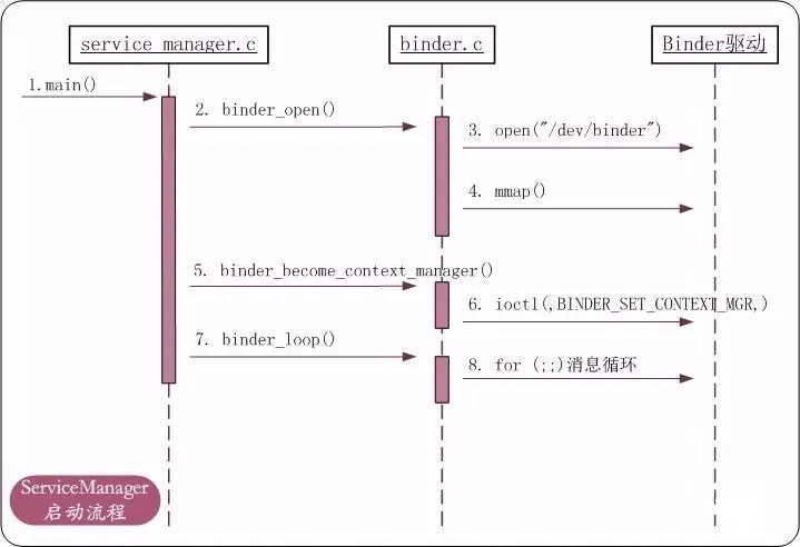ServiceManager是如何启动的? 这里简要介绍一下ServiceManager的启动方式。当Kernel启动加载完驱动之后,会启动Android的init进程,init进程会解析servicemanager.rc,进而启动servicemanager.rc中定义的守护进程。