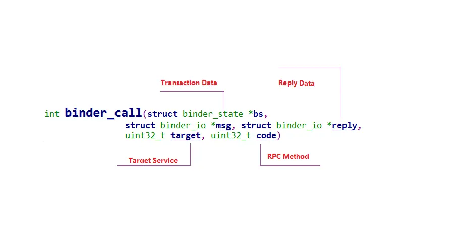(1) 、bs = binder_open(128*1024) (2) 、binder_call(bs, &msg, &reply, target, SVC_MGR_CHECK_SERVICE) 参数说明: // msg含有服务的名字 // reply它会含有servicemanager回复的数据, 表示提供服务的进程 // target为0表示servicemanager // code: 表示要调用servicemanager中的”getservice函数”