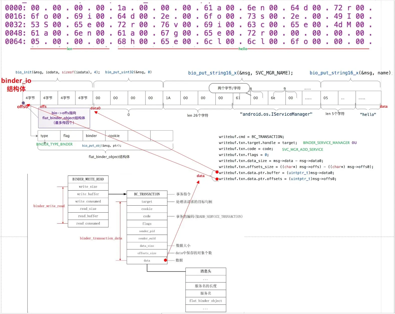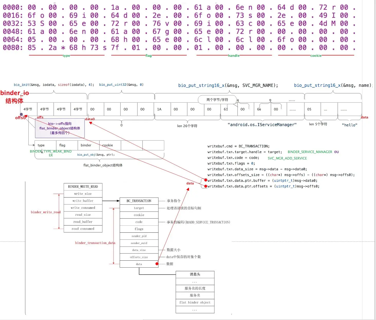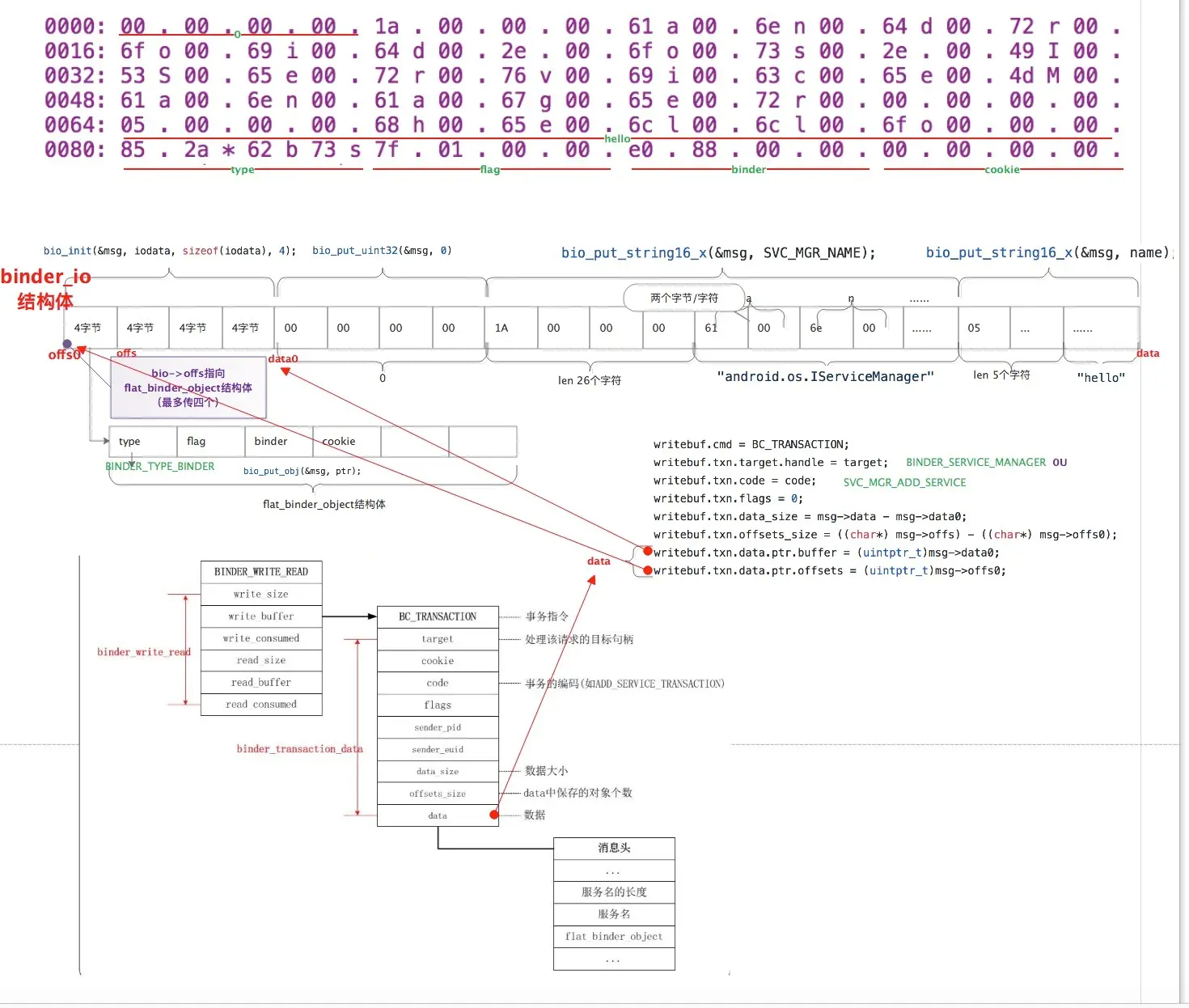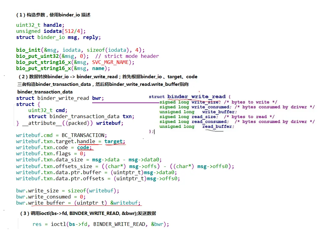 (1) 、bs = binder_open(128*1024) (2) 、binder_call(bs, &msg, &reply, 0, SVC_MGR_ADD_SERVICE) 参数说明: // msg含有服务的名字 // reply它会含有servicemanager回复的数据 // target为0表示servicemanager // code: 表示要调用servicemanager中的”addservice函数”