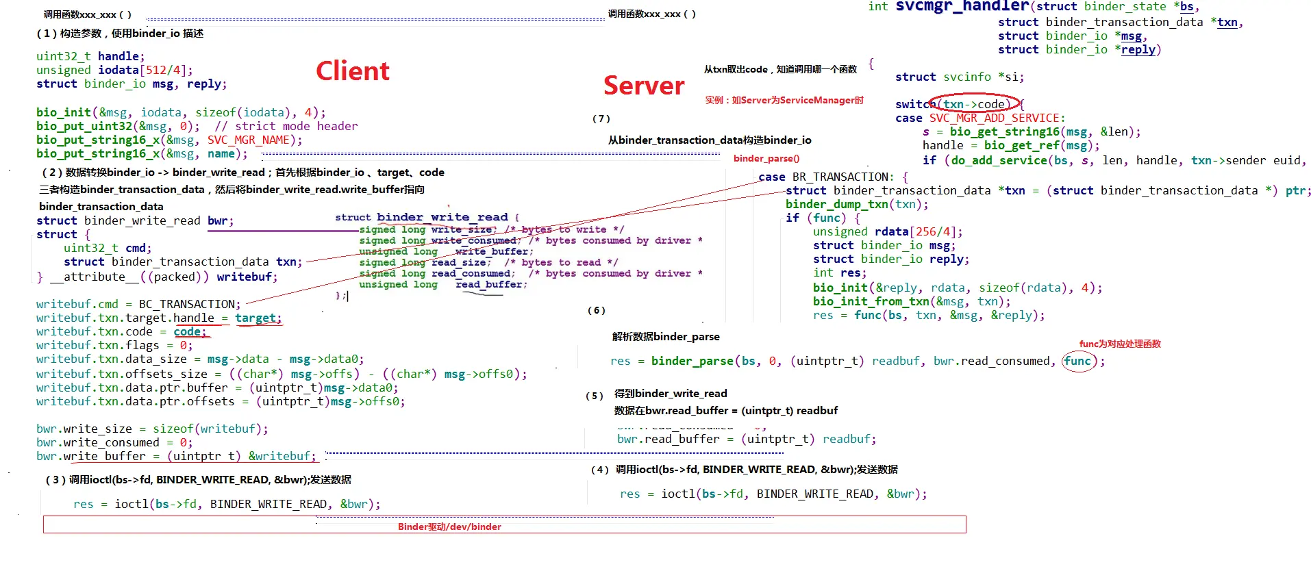 binder_loop()主要工作: (1)、通过ioctl(,BINDER_WRITE_READ,)进入消息循环,休眠等待Client请求 (2)、当Client通过驱动请求服务时,binder驱动会唤醒ServiceManager,通过binder_parse()解析处理数据,回复信息