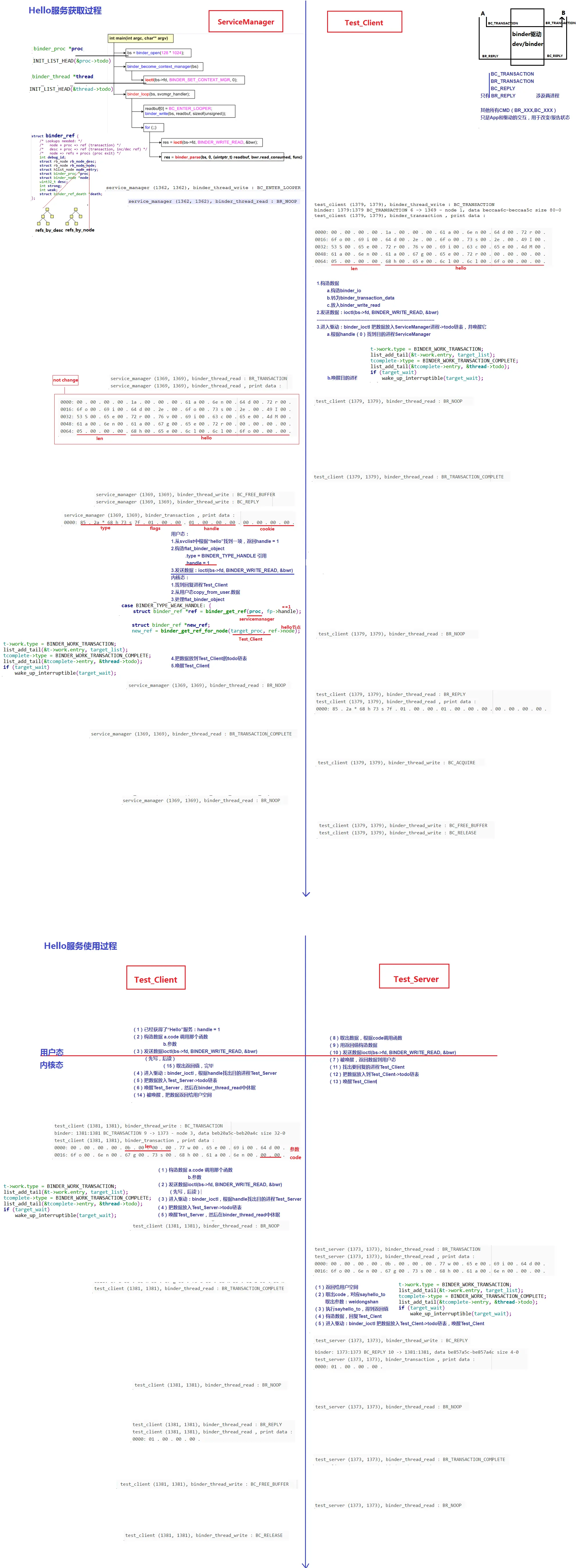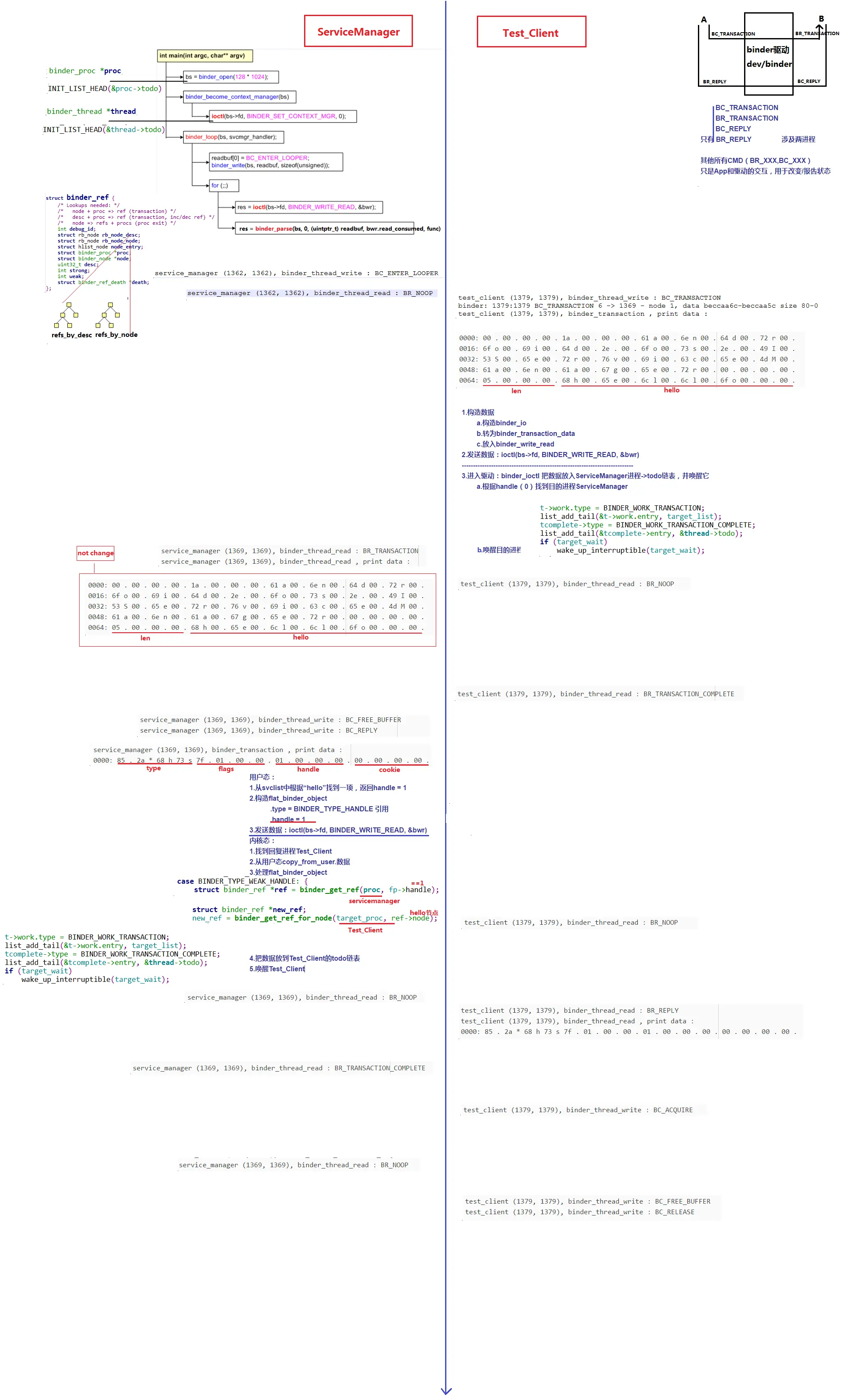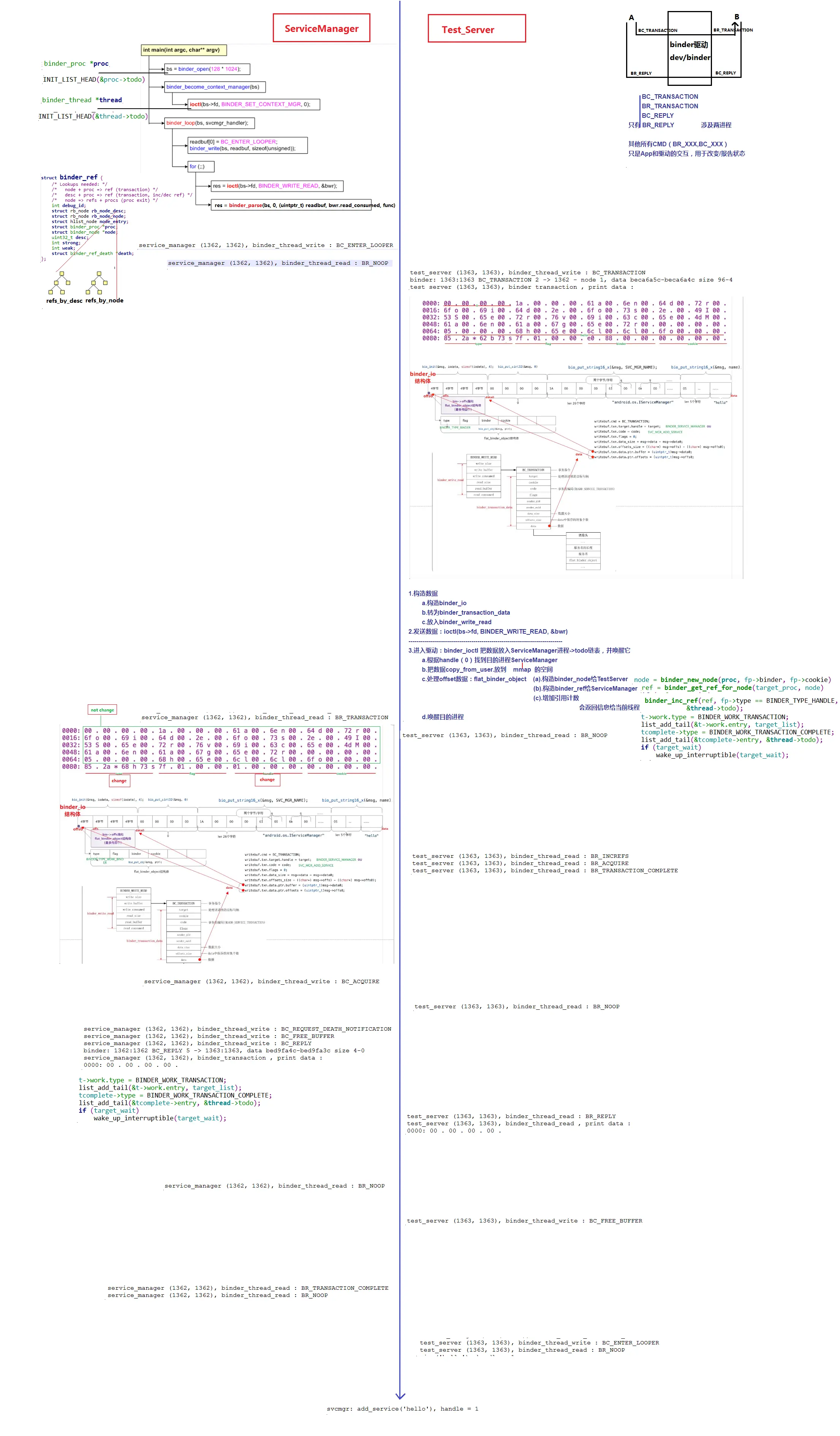OK,到现在为止,还有两个待处理事务:(01) ServiceManager待处理事务列表中有个BINDER_WORK_TRANSACTION_COMPLETE类型的事务 (02) TestServer待处理事务列表中有个BINDER_WORK_TRANSACTION事务。
