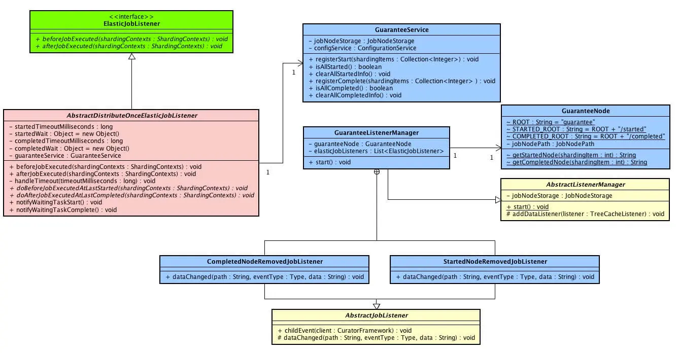 - 粉色监听器接口 AbstractDistributeOnceElasticJobListener,分布式场景中仅单一节点执行。