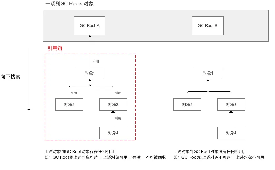 将一系列的 GC Roots 对象作为起点,从这些起点开始向下搜索。