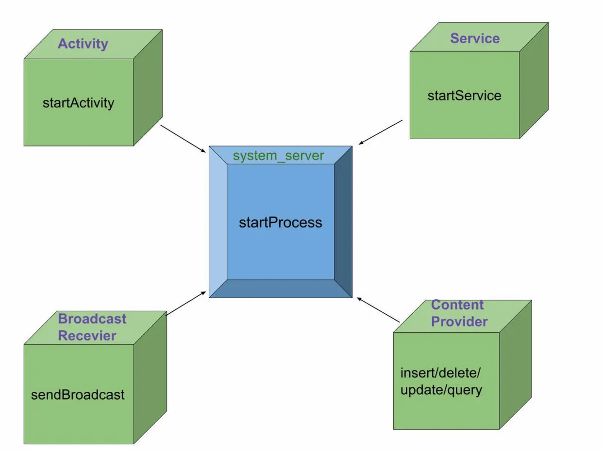 这里我们来讨论冷启动的过程,进程启动原则上有四种途径,也就是通过其他进程对该APP的四大组件的调用来实现。
