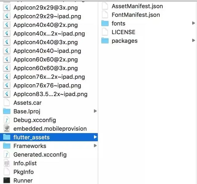 flutter_assets 是 Flutter 资源,App.framework 和 Flutter.framework 是代码,位于 Frameworks 目录中。