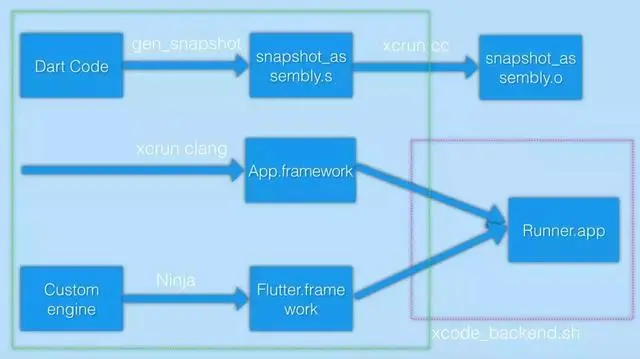 Flutter 相关代码的最终产物是 App.framework(由 Dart 代码生成)和 Flutter.framework(引擎)。在 Xcode 项目中,Generated.xcconfig 描述了与 Flutter 相关的环境配置信息,在 Runner 项目设置中新增的 xcode_backend.sh 实现了一个副本(从 flutter 框架代码库到 Runner 项目根目录下的 Flutter 目录)和 Flutter.framework 的嵌入以及 App.framework 的编译和嵌入。