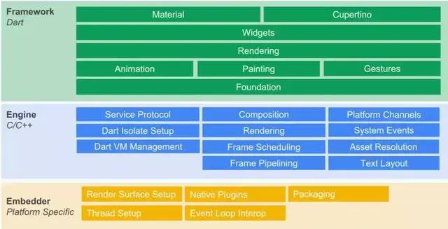 Flutter框架从上到下包含三个不同的层:框架、引擎和嵌入器。