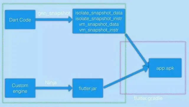 Flutter.jar 类似于 iOS 的 Flutter.framework,包括引擎代码(Flutter.jar 中的 libflutter.so)以及一组将 Flutter 嵌入到 Android 中的类和接口(FlutterMain、FlutterView、FlutterNativeView 等)。事实上,flutter.jar 位于 Flutter 代码库的 /bin/cache/artifacts/engine/android* 中,默认从谷歌代码库中拉取。当需要自定义更改时,可以使用 Ninja 系统下载引擎源代码来生成 flutter.jar。
