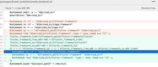 这部分的逻辑与构建有关,位于 xcode_backend.sh 中。为了确保每次都能获得正确的 Flutter.framework,Flutter 每次都会根据配置查找并替换 Flutter.framework(请参阅 Generated.xcconfig 配置)。不过,这会导致重新编译依赖于这个框架的项目代码。必要的修改如下: