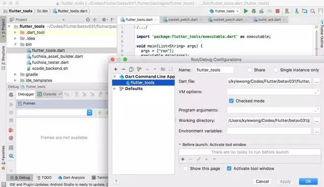 b. 将 packages/flutter_tools 作为 Dart 项目打开,并添加新的“Dart Command Line App”配置