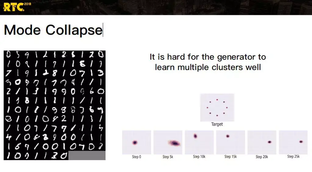 换一个图来看,比如分布是一个均匀的圆,生成器可能最后收敛到某一个地方,总收敛到某一个地方也总通过。判别器因为总通过,网络状态最后就收敛这么一个状况。生成器比较难于生成这种多模态、有多个聚类的分布,我们把这个现象叫模式坍塌。