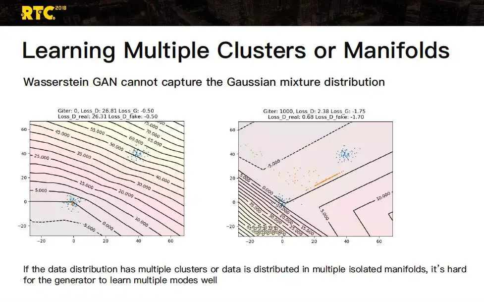 这个曲面在三维空间,我们叫环境空间。Wasserstein 设计了一个生成对抗网络其实也有很多层,到达十层的网络。他要做的事情就是把两个高斯分布:一个在零点,一个在 40×40 的地方,把分布学会。结果发现这个多达十层的一个深度学习网络居然学不会,当收敛之后表现为橘色这些点,就是最后收敛的状态。当数据分布有多个聚类或者多个峰值混合分布的时候,这样的流形对生成对抗网络是有挑战的。