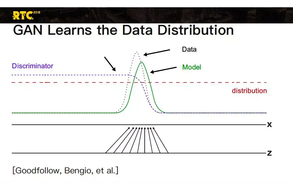 生成器就是把一个随机的分布,一个噪声 Z,经过生成器之后产生一个图像能跟真的很像。下图形象地表示生成器在逼近真实数据的分布,绿色是这个模型产生的分布,在相互矛盾冲突之中逐渐达到真实数据就是黑色虚线的分布。Z,就是我刚才说的,比如说一个随机变量,它能生成出我们想要的结果,从公式上说实际上生成器在做一件事,它是使判别器犯错的概率最大,就是判别器分不出真假,分不出生成东西是假的,就是要让它犯错。