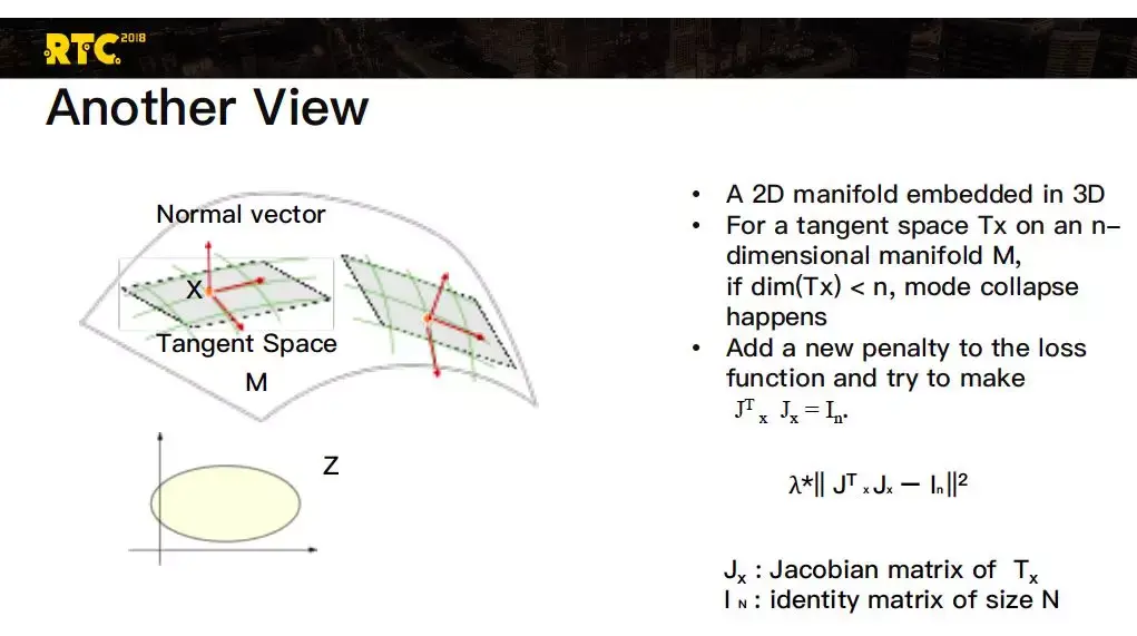 再换一个视角来看模式坍塌,这个视角可能更好理解一点。举例子来说,三维空间中有一个二维曲面,每一个点上有一个切面,对较为规范的流形来说这个切面应该是一个二维的平面,当这个二维的平面退化成一条线甚至是零维的一个点,这时候模式坍塌一定发生。因为退化成一条线的时候,在其法向量方向上,另外一个坐标轴再怎么变都不影响结果,这是模式坍塌。退化成零维的时候更是如此了。